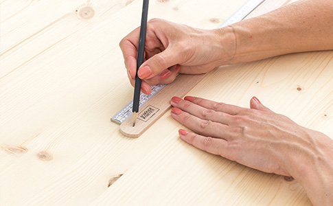 Zeichne ein Mittelriss für die Bohrung auf die Schmalseite der Leisten.