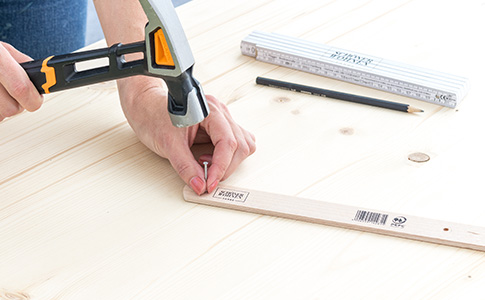 4. Nagel in der anderen Markierung deine Leiste mittig auf das auszusägende Stück Holz