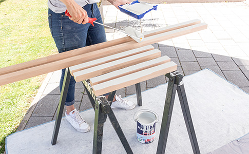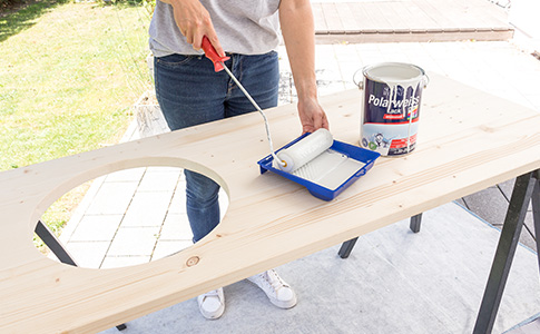 Lackiere die Holzteile mit dem Polarweiss Lack. Benutze hierfür eine Lackierrolle.