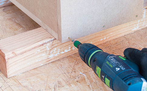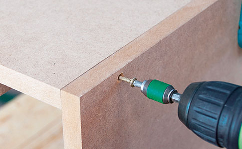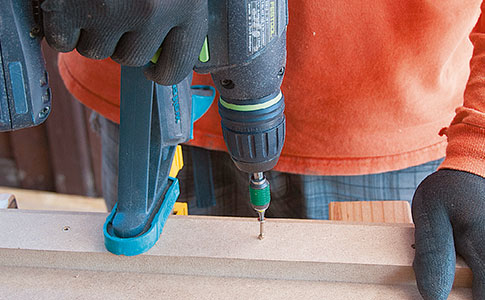 An den Seitenteilen verschraubst Du die Auflageleisten jeweils ca. 30 mm unterhalb der oberen Kante. Dafür bohrst Du zunächst vor und senkst die Löcher an.