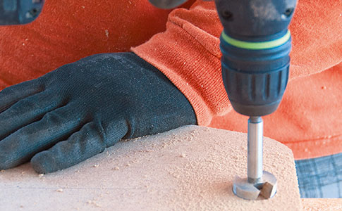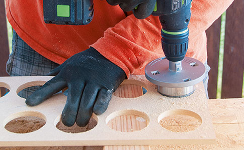 Für den Flaschenhalteraufsatz mit der Lochsäge die Aussparungen für die Flaschen bohren. Körnere den Bohrpunkt zuvor an.