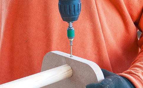 Zur Befestigung der Griffstange mit dem Forstnerbohrer in jede Stirnseite ein Loch mit dem Durchmesser des Rundstabs (30 mm) bohren. Vorher ankörnern!