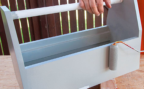 Schleife die Flaschenkiste und den Flaschenhalteraufsatz vor dem Anstrich gründlich an und säubere diese anschließend. Grundieren, nach Trocknung 2x grau lackieren und Flaschenhalteraufsatz einsetzen – fertig.