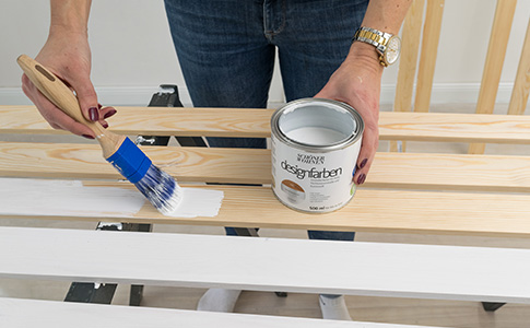 Streiche am besten erst einmal alle Ecken und Kanten rund um die Holzlatten sowie Decke, Boden und Seitenwände mit einem breiten Pinsel und der Designfarbe.