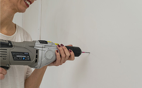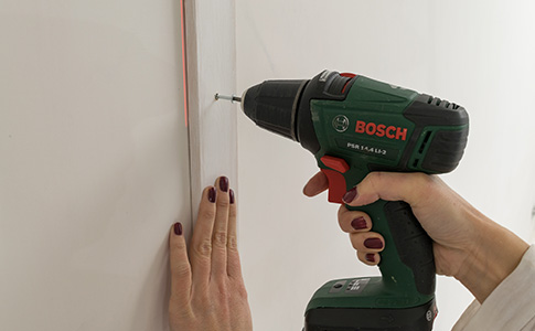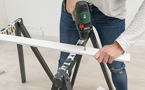 Bohre nun die entsprechenden Löcher in die Wand, platziere die Dübel und befestige darin die Latte an der Wand.