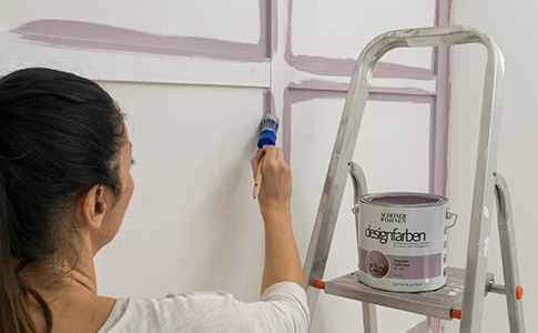 Beginne mit einer Skizze. Überlege und berechne möglichst maßstabgetreu, wie viele Quadrate Deine Wand am Ende haben soll. Auf dieser Grundlage kannst du dann auch Deinen Materialbedarf berechnen. Besorge Dir im Baumarkt Holzplatten, Schrauben, Grundierfarbe sowie eine Designfarbe deiner Wahl. Streiche Deine Holzleisten mit der Grundierfarbe von SCHÖNER WOHNEN-Farbe und lasse sie trocknen.