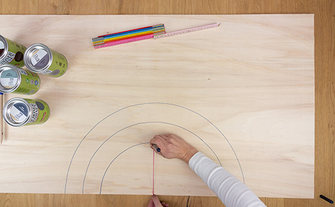 Zeichne mit Hilfe eines Stiftes, den du an eine Schnur knotest, 5 Halbkreise mit Radius 30cm, 25cm, 20cm, 15cm, 10cm an den Rand deiner Holzplatte.