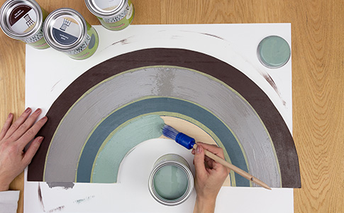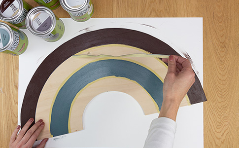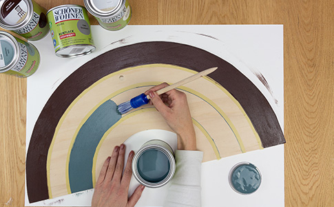 Lackiere den äußeren Halbkreis-Ring in Schokobraun und den dritten Ring in Petrolgrün.
