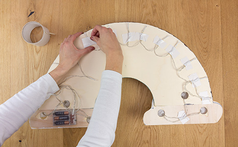 Die restlichen Lämpchen klebst du als Ambient-Light ohne Bälle an den oberen Rand des Regenbogens und fixierst sie mit Klebeband. Auch das Batteriefach klebst du mit Klebeband so am Rand fest, dass du von vorn den Schalter bedienen kannst.