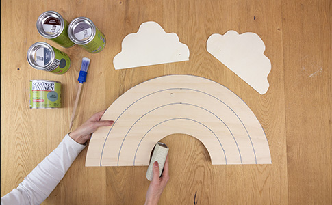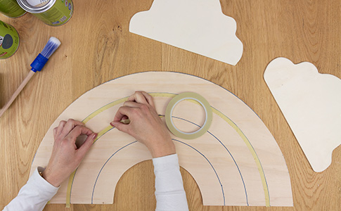 Wenn alles getrocknet ist, gib Holzleim auf die Rückseite der Wolken und klebe sie auf die Enden des Regenbogens.