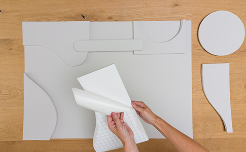 Wenn Du die Teile einzeln beschichtet hast, kannst du nach Trocknung die Teile auf die HDF Platte kleben. Hierzu wird die Klebefolie an den Kappa Fix Platten abgezogen und auf die HDF Platte geklebt.