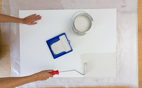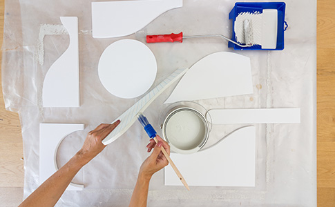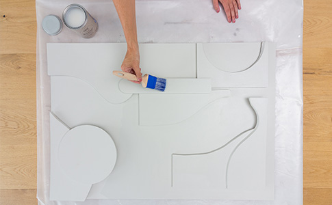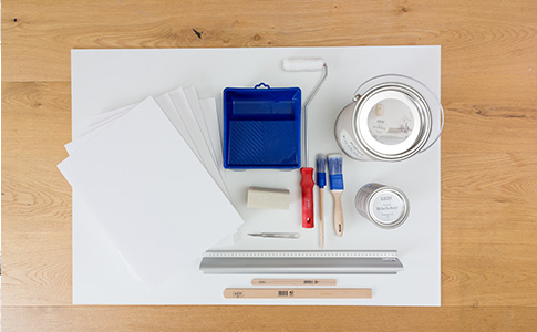 Sind die Teile abgeschliffen, können diese mit der SCHÖNER WOHNEN Naturell Kreidefarbe beschichtet werden. Hier kannst Du entweder die Teile einzeln beschichten und sie im Anschluss auf die gestrichene Fläche kleben oder Du klebst die Teile direkt auf die unbeschichtete Fläche und beschichtest sie dann in einem.