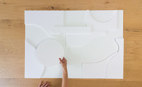 Im Anschluss können verschieden Formen aus den Kappa Fix Platten ausgeschnitten werden. Dieses können Kreise, Rechtecke oder ganz freie Formen sein. Wir empfehlen eine Schneideunterlage unter die Platten zu legen und dieses mithilfe eines Cuttermessers auszuschneiden.
