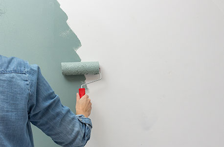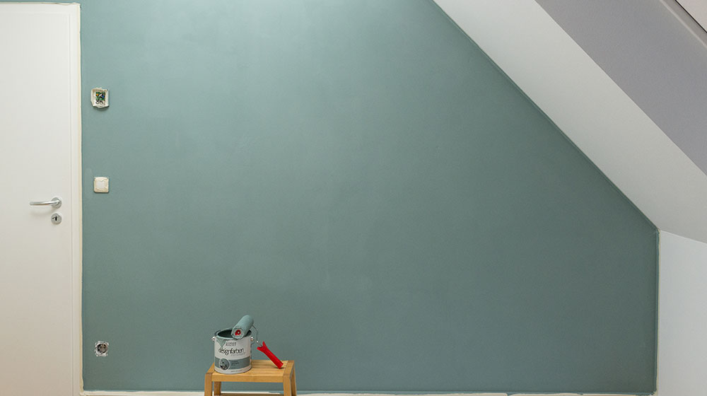 Bevor die Wand mit der Designfarbe Erhabenes Agavengrün gestrichen wurde, wurden noch ein paar Vorbereitungen getroffen. Die Ecken und Ränder der zu bearbeitenden Fläche sowie Steckdosen, Fenster- und Türrahmen etc. wurden sorgfältig abgeklebt und der Boden und die Möbel mit einer Folie abgedeckt.