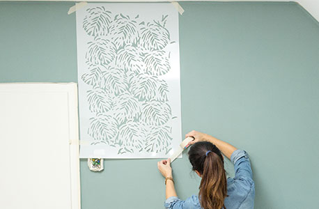 Die Schablone wurde erst mit den Händen schön glatt gestrichen und dann mit Malerkreppband direkt auf der Wand befestigt.