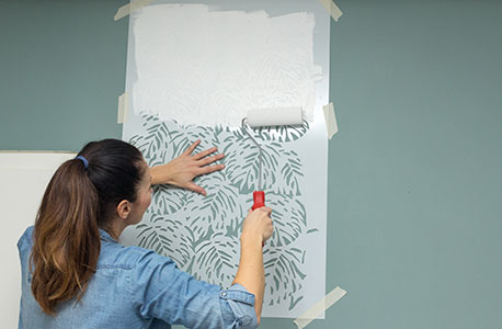Mit gleichmäßigen Bewegungen und ein wenig Druck, wurde nun über die Schablone gerollt und die weiße Farbe so durch alle Aussparungen hindurch auf die Wand aufgetragen.