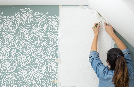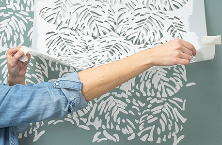 Für das Anbringen der allerersten Schablone und anschließendes Überrollen haben Moni & Steffi sich eine große, freie Fläche mit einer geraden Begrenzung an der Wand (hier der Türrahmen) gesucht. Dies ist wichtig, damit die allererste Schablone exakt gerade sitzt, denn an ihr orientieren sich alle Weiteren.