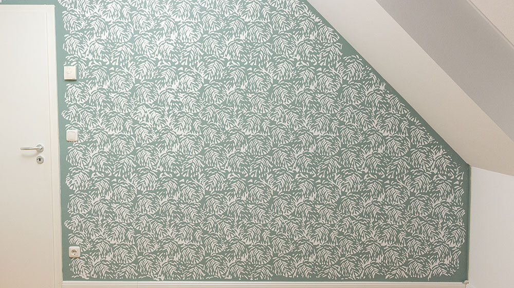 Beim Erreichen von Ecken oder Schrägen wurde die Schablone in die Ecke hineingebogen und die Farbe mit Hilfe eines Pinsels auf die Schablone aufgetragen. Ebenso ist die Vorgehensweise bei Lichtschaltern und Steckdosen. Auch hier wird die Schablone einfach so nah wie möglich an die Wand gebracht und mit Pinsel statt Rolle gearbeitet.