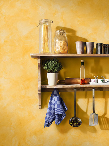Töne die Wisch-Optik Effektlasur mit einer Vollton- & Abtönfarbe ab, die der im vorangegangenen Arbeitsschritt gestrichenen Trendfarbe am nächsten kommt. Je ähnlicher die Farbtöne, desto ruhiger wirkt die Oberfläche. Für wolkige Effekte setzt Du zuerst Flecken mit der Strukturbürste und verwischst diese dann anschließend ineinander. Für ein gleichmäßigeres Oberflächenbild trägst Du die Effektlasur dünn auf und verwischen diese direkt beim Auftrag. Arbeite dabei immer „nass in nass“.