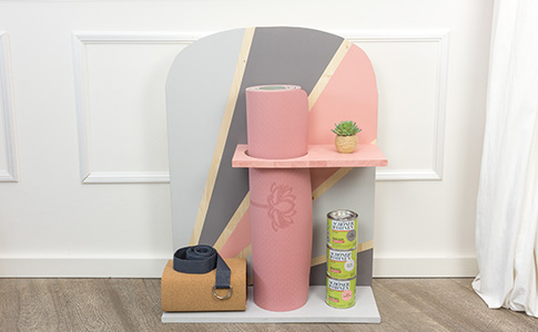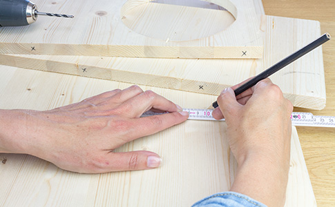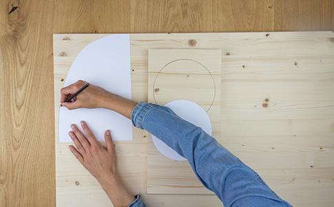 Die oberen Kanten der großen Multiplexplatte (50 x 75 x 1,8 cm) sollen abgerundet werden. Um die Abrundungen auf der Platte mit einem Bleistift einzuzeichnen, kannst Du eine vorher angefertigte Schablone aus einem Stück Papier nutzen. Auf der einen Platte der zwei kleinen Multiplexplatten (50 x 20 x 1,8 cm) wird mithilfe eines Zirkels ein Kreis eingezeichnet Die Größe des Kreises orientiert sich dabei an dem Durchmesser der aufgerollten Yogamatte.
