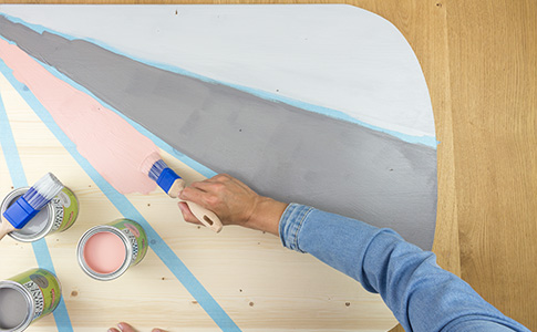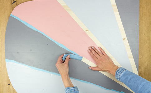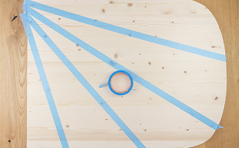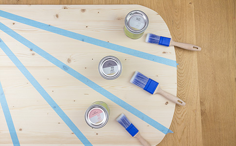 Auf der großen Platte kann mithilfe eines Bleistifts ein beliebiges Muster eingezeichnet werden. Wir haben uns für verschiedene Streifen entschieden. Hierfür haben wir vier Linien links in der Ecke angesetzt und zu den Endkanten der Platte hochgezeichnet. Auf die Linien haben wir im Anschluss Klebeband aufgebracht, um die gewonnenen Flächen sorgfältig beschichten zu können.