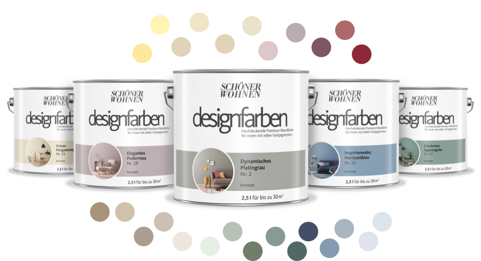Der All-Over-Look ist ein echtes Trendthema. Immer häufiger sieht man Interieurs mit Wänden und Wohnaccessoires im selben Farbton. Die Elemente gehen optisch ineinander über, was den Raum beruhigt und elegant wirken lässt. Hast Du Lust, den All-Over-Look bei Dir umzusetzen? Die SCHÖNER WOHNEN Designfarben sind perfekt dafür, denn ihre hochkonzentrierte Pigmentformel und enorme Deckkraft sorgen für überzeugende Ergebnisse mit faszinierender Farbtiefe. Insgesamt stehen Dir 30 Töne zur Auswahl, die alle von Designexperten entwickelt wurden.