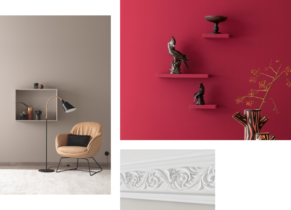 Für einen einzigartigen Look lässt Du neben den Wänden weitere Elemente Teil Deiner Farbgestaltung werden. Die können u. a. aus Holz und Kunststoff sein, wie beispielsweise Stuckleisten, Bilderrahmen, Holzpaneele, Zierleisten, Bilderleisten, Wohnaccessoires oder ein Kabelkanal, der auf der Wand verläuft. Sie alle kannst Du in Deinem Lieblingston streichen. Was Du dazu brauchst, ist unsere neue Designfarben Grundierfarbe.