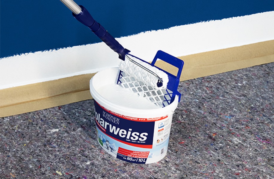 Achten Sie beim Kauf der Farbrolle auf einen hochwertigen Flor, der nicht fusselt und ausreichend Farbe aufnimmt. Wir empfehlen Ihnen unseren Profi-Farbroller. Denken Sie auch an Malerband und Folie, um den Fußboden und Möbel vor Klecksen und Spritzern zu schützen und eventuell eine Grundierung, falls der Untergrund zu stark saugt.