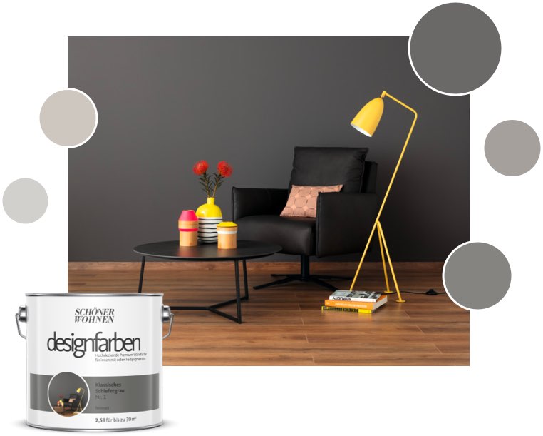Die richtige Wandfarbe spielt eine große Rolle bei der Gestaltung Deines Heimkinos. Wenn Du einen Fernseher nutzt, streich die Wand rund um das Gerät möglichst dunkel, damit die Schwarzwerte mit Bild höher sind. Kleine Räume mit dunklen Wänden und Möbeln wirken schnell überladen. Ein schöner Grauton an einer einzelnen Wand und möglichst zierliche Möbel lassen dem Raum dagegen Luft zum Atmen. Sieh Dir die Wirkung unserer Designfarbe Klassisches Schiefergrau in diesem Video an. Weitere Grautöne findest Du bei unseren Designfarben.