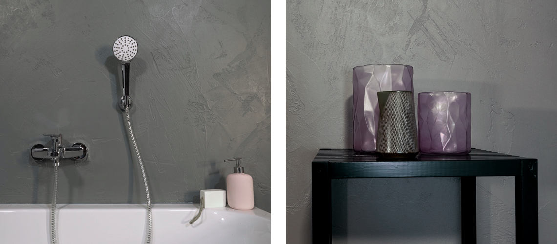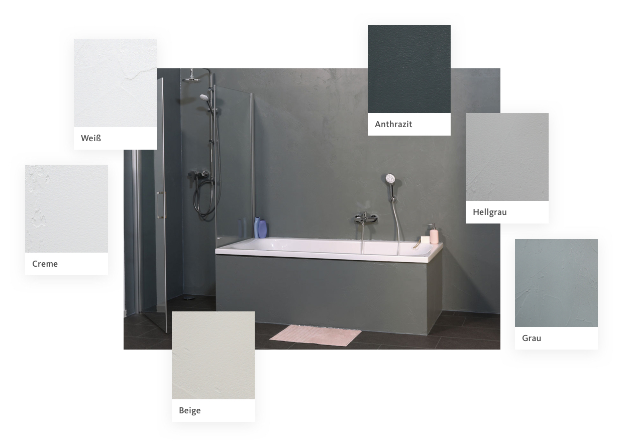 Die Verarbeitung der Trendstruktur ist einfach, die Oberfläche am Ende fugenlos. Und so geht’s: Erst schützt Du den Boden und die angrenzenden Wände mit Folie und Malerkrepp. Dann entfernst Du die Armaturen und klebst die Wasserrohre ab. Anschließend werden alte Silikonfugen beseitigt und die Fliesen entfettet. Jetzt musst Du nur noch den Wandspachtel anrühren und schon geht’s los.