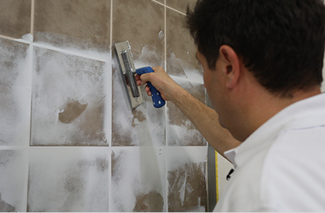 Zunächst geht es darum, die Fugen zwischen den Fliesen mit dem Wandspachtel zu füllen. Nach einer Stunde Trocknungszeit geht es an die nächste Schicht.