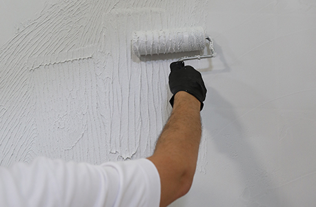 Der Wandspachtel wird per Spezialroller aufgetragen, sodass die Fliesen komplett bedeckt sind. Danach ziehst Du mit einer Kelle diese erste Putzschicht glatt. Vor dem nächsten Arbeitsschritt lässt Du wieder alles trocknen (mindestens 24 Stunden) und schleifst die Fläche leicht an.