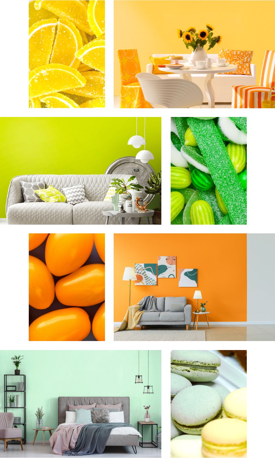 Bonbonfarben sind vielseitig und strahlen, auch untereinander kombiniert, eine freundliche Atmosphäre aus. Gerade helle Bonbonfarben machen gute Laune und lassen kleine Räume größer erscheinen. Aber: Pastell muss nicht sein! Wenn Du Dir Deinen eigenen Ton mischt oder mischen lässt, achte darauf, dass das Ergebnis nicht zu dunkel ausfällt, sondern eher kräftig.