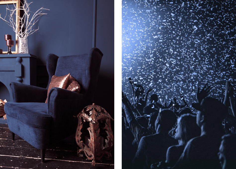 Getanzt wird vor der Mainstage (Deinem Wohnzimmer). Das charakterstarke Blauschwarz von Blueberry an den Wänden sorgt für die perfekte Stimmung und lässt sich wunderbar mit knalligen Accessoires und Einrichtungsgegenständen kombinieren.