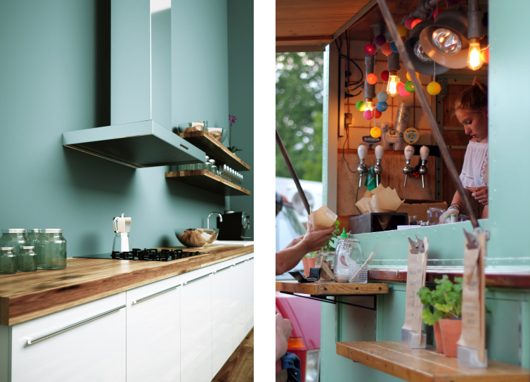 In der Küche streichst Du die Wände mit Frozen, einem frischen Türkisgrün. Vom Vegan-Burger bis zum gut gekühlten Dosenbier – hier ist für Dein leibliches Wohl gesorgt und Du tankst neue Energie, bevor weitergefeiert wird.