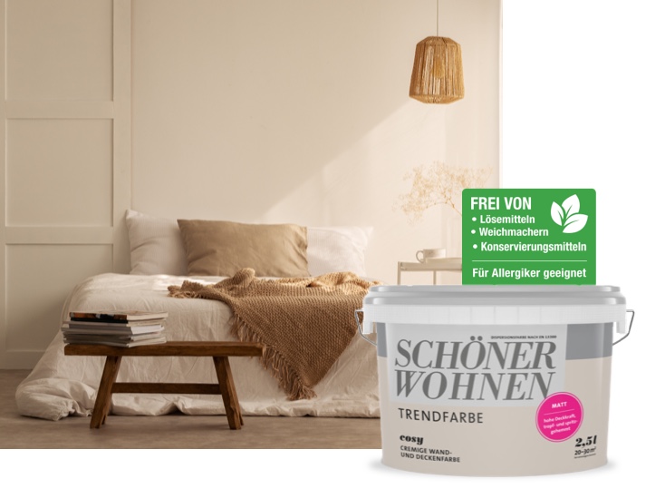 Eva ist immer wieder von der Cremigkeit und Deckkraft unserer Trendfarben begeistert. Das gilt natürlich auch für Cosy. Dank der tropfgehemmten Konsistenz lässt sich die Farbe leicht verarbeiten. Die besondere Rezeptur sorgt für ein mattes, leicht raues Finish, das die gemütliche Wirkung noch unterstreicht. Die hohe Deckkraft verleiht dem modernen Beige dabei eine besondere Farbtiefe. Wie alle unsere Trendfarben enthält auch Cosy keine Konservierungsmittel und ist damit für Allergiker geeignet. Du erhältst Cosy in den Größen 50 Milliliter (Tester), 1 Liter und 2,5 Liter.