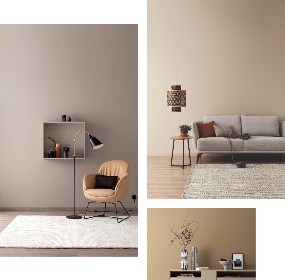 Braun kommt in der Natur sehr häufig vor, zum Beispiel in Form von Erde oder Holz. Viele Menschen empfinden Räume in den entsprechenden Farbtönen als besonders behaglich. Mit den harmonischen Brauntönen unserer Designfarben holst Du Dir eine Extraportion Gemütlichkeit nach Hause. Warmes Erdbraun betont mit einnehmendem Tiefgang und Herzlichkeit, alles was Du liebst. In einem Raum mit dieser Farbe an der Wand fühlst Du Dich einfach wohl. Fast würdevoll und mit einem begehrenswerten Hauch Erhabenheit zieht Edles Kaschmirbraun bei Dir zu Hause ein und umhüllt Dich mit behaglicher Exklusivität. Mit Gemütliches Wollbeige schaffst Du Dir genau das, wonach Du Dich in der kalten Jahreszeit sehnst: ein Rückzugsort und Lieblingsplatz, der behaglich ist und Deinem Wohlbefinden so gut tut.
