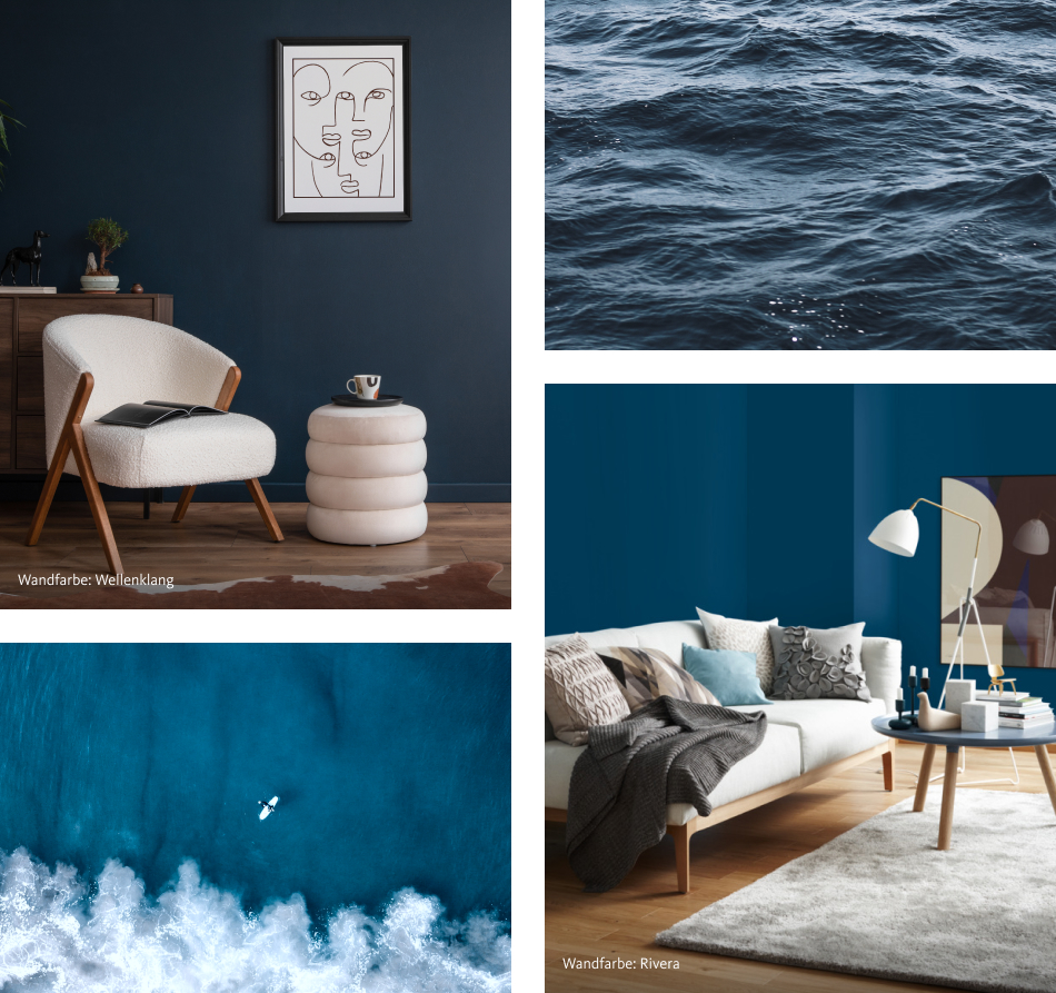 Nach Hause holst Du Dir die Farbe des Meeres mit dem tiefen Blau unserer Trendfarbe Riviera oder mit der Naturell Kreidefarbe Wellenklang. Daneben erinnern weiße Flächen an Segelboote am Horizont.