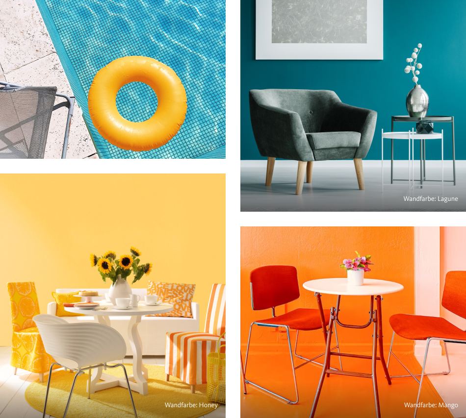 Der charaktervolle Türkiston der Trendfarbe Lagune fängt diese Unbeschwertheit perfekt ein. Dazu passt ein sonniges Gelb oder Orange wie Mango oder Honey und schon fühlst Du Dich wie auf einem Handtuch in der Sonne mit einem Eis in der in Hand, kurz bevor Du im Becken abtauchst.