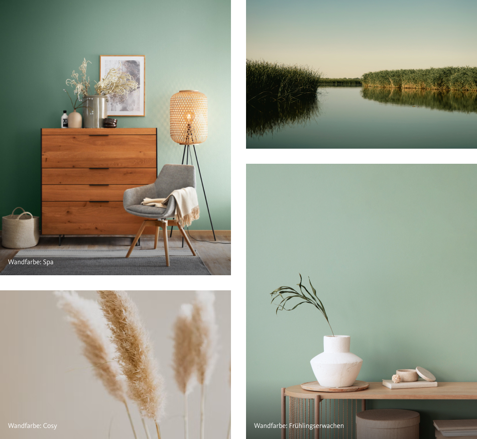 Diese Farbnuancen erinnern uns an das Olivgrün der Naturell Kreidefarbe Frühlingserwachen oder den hellen Grünton der Trendfarbe Spa von SCHÖNER WOHNEN. Kombiniere das Grün mit einem Beige wie Cosy, um zu Hause das Schilf am Ufer des Sees nachzuempfinden.
