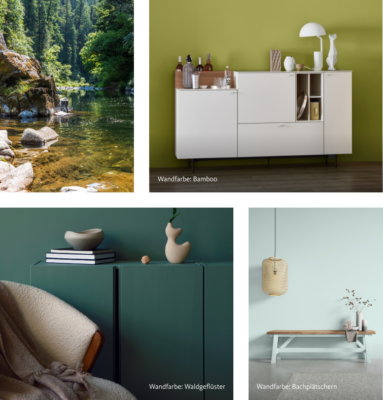 Manchmal ist Flusswasser klar, manchmal hat es einen leichten Blauton so wie das klare Hellblau von Bachplätschern, einer der SCHÖNER WOHNEN Naturell Kreidefarben. Besonders gut macht sich der Ton neben dem satten Grün von Waldgeflüster oder der frischen Trendfarbe Bamboo.