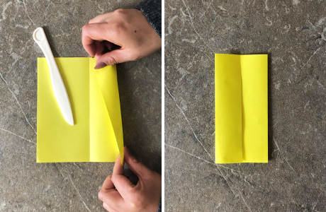 Zuerst faltest und entfaltest Du das Blatt senkrecht in der Mitte. Danach faltest Du die Seiten zur Mittellinie und wieder zurück.