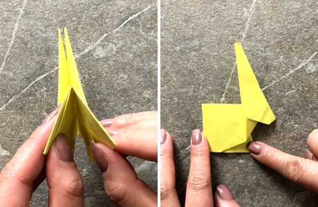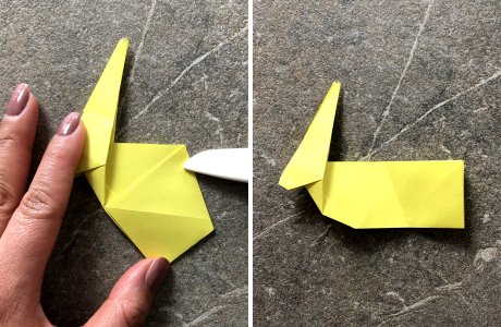 Anschließend faltest Du den Osterhasen der Länge nach zusammen. Dann ziehst Du die spitzen Ohren ein Stück nach oben, so dass sich der Kopf neigt. Anschließend drückst Du alles flach.