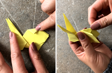 Zum Schluss faltest Du die beiden Ohren einmal komplett nach vorn und quetscht Sie dann mit dem Finger etwas auseinander. Fertig!