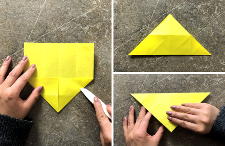 Wieder klappst Du das spitze Ende auf die Rückseite und wendest das Papier, sodass die geschlossene Seite oben liegt. Die oberste Spitze faltest Du nach unten, sodass ein kleines Dreieck entsteht.