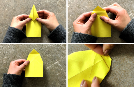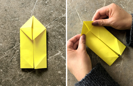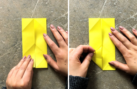 Falte anschließend die linke und rechte Kante wieder zur Mitte. Jetzt liegen die rechte untere Ecke und die linke untere Ecke des Blattes an der Mittellinie.