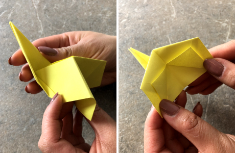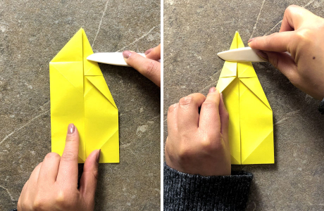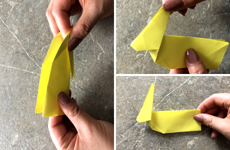 Jetzt klappst Du den Hasen hinten auseinander, schlägst die beiden Kanten nach innen ein und entfaltest sie anschließend wieder. Die beiden Hälften faltest Du jeweils diagonal bis zur Mittellinie, sodass zwei Dreiecke entstehen.