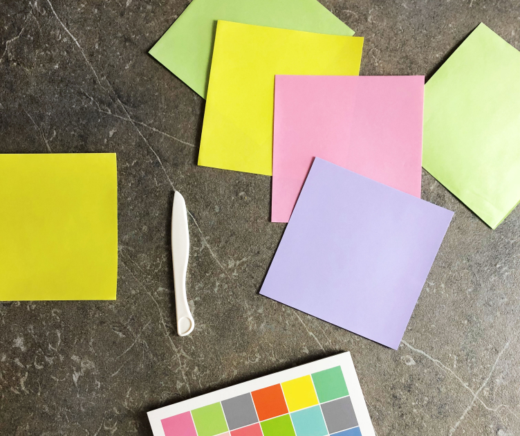 Alles, was Du brauchst, ist ein quadratisches Blatt Papier, zum Beispiel in der Größe 15 mal 15 cm. Ein sogenanntes „Falzbein“ erleichtert Dir das Falten und sorgt für präzisere Kanten. Es gibt sie in gut sortierten Bastelgeschäften.