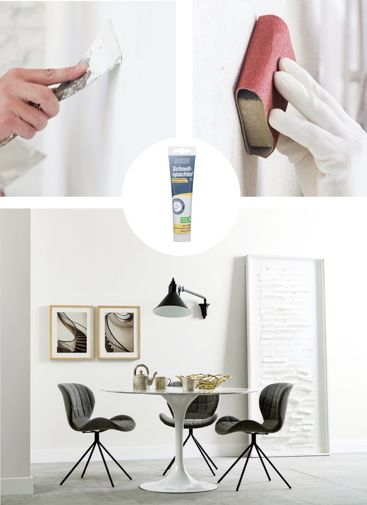 Kleine Schrammen und Kerben besserst Du am besten mit dem weißen Schnellspachtel von SCHÖNER WOHNEN-Farbe schnell und einfach aus. Er trocknet besonders eben und ist anschließend ganz einfach schleifbar, so sind die Macken in der Wand schnell verschwunden. Auch Bohrlöcher lassen sich mit dem Schnellspachtel wunderbar wieder verschließen.