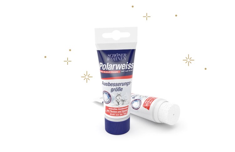 Ebenso praktisch ist Polarweiss in der handlichen 50-ml-Tube inklusive Auftragsschwamm. Auch damit besserst Du Flecken und Spuren ganz einfach aus. Die smarte Tube hat aber noch einen Vorteil: Sie ist der perfekte Helfer zum Erstellen von scharfen Farbkanten. Wie das geht? Ganz einfach: